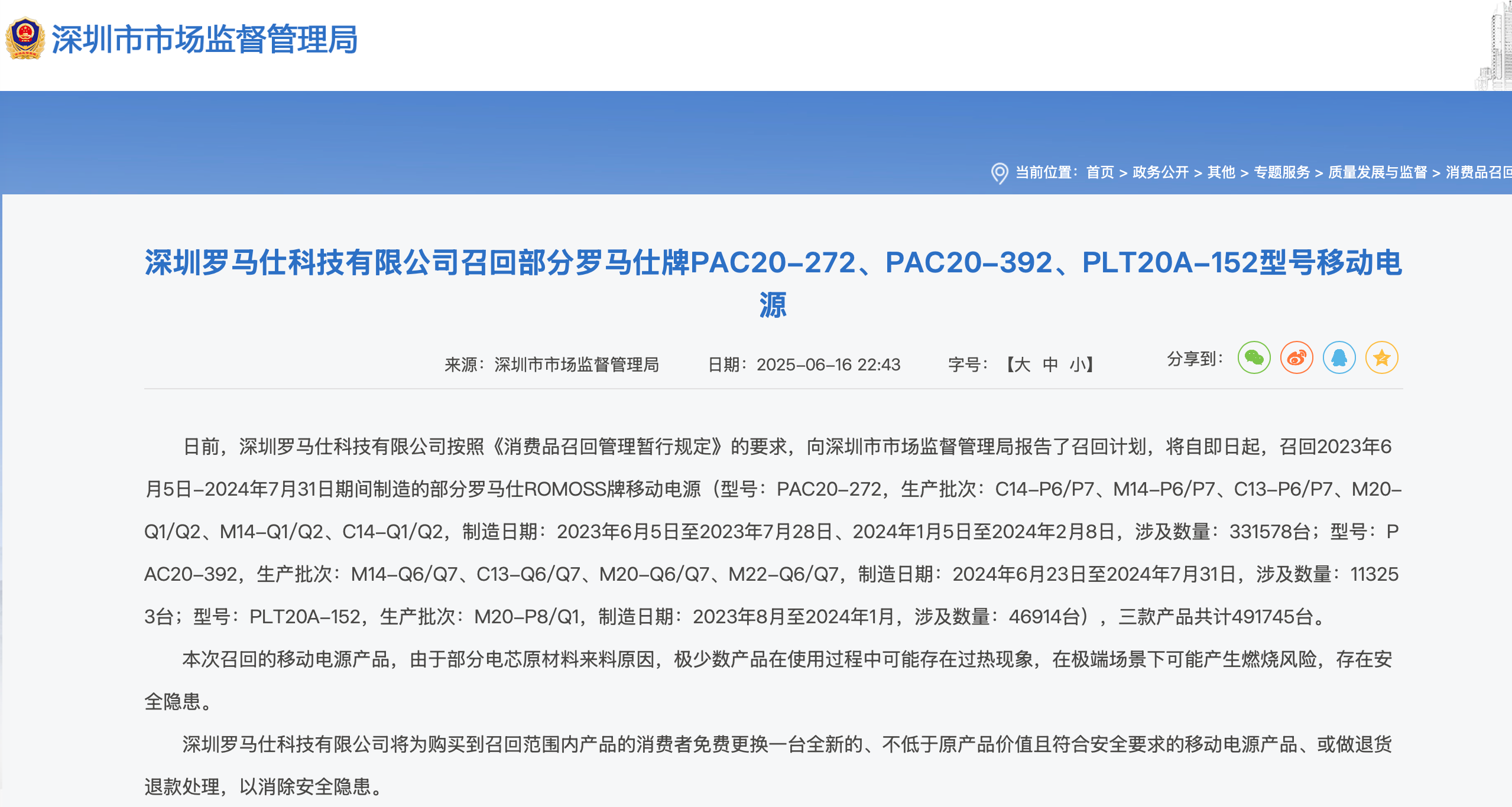 【环球网科技综合报道】6月17日消息,据深圳市市场监督管理局网站公示,日前,深圳罗马仕科技有限公司按照《消费品召回管理暂行规定》的要求,向深圳市市场监督管理局报告了召回计划,将自即日起,召回2023年6月5日-2024年7月31日期间制造的部分罗马仕ROMOSS牌移动电源,三款产品共计491745台。